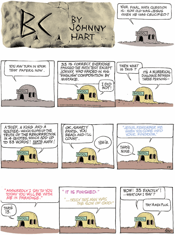 This is the Obit and last comic strip for BC a comic strip drawn by Johnny Hart.
