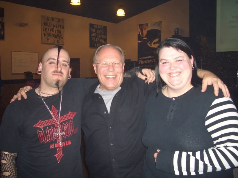 There is a couple here, @ NLC, who go to Goth concerts and witness to the attenders. They don't go inside, but they do actively talk to passersby. Here is a pic of them after they spoke to our youth. They love the Lord with all their heart and I would love to have 20 more just like them. You would not believe this guy's story of mental abuse as a school boy. It is a miracle that he is alive. We love he and his wife, Ruthy unconditionally and love the acceptance they receive from the folks @ NLC. I really do love these people. They have received the "cold shoulder" from more than one church for being different. They actually asked "permission" to attend and wondered if it would be all right if Goths got saved to bring them to church! So sad, they even had to ask. I told them, "God forbid that someone would come to church seeking Jesus that looks weird!" :