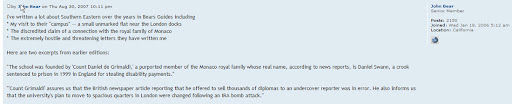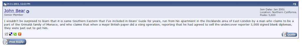 He is the author of Bears' Guide to Earning Degrees by Distance Learning ... now in its 16th edition As posted previously he lists Southern Eastern University as a diploma mill in Chapter 25 of his 12th edition and others as well. On page 229 of his 2003 edition he speaks of Count Daniel Grimaldi/Swann .... http://books.google.com/books?id=k67...&ei=4WE0TJL0C4 A forum poster, who is believed to be John Bear at various degree forums goes into some detail about the nefarious founder of SEU here: http://www.degreediscussion.com/foru...php?f=3&t=3759 http://forums.degreeinfo.com/distanc...niversity.html http://lh4.ggpht.com/_rjZMUSTyomU/TD...20grimaldi.png http://lh3.ggpht.com/_rjZMUSTyomU/TD...i8Hg/bear2.png http://lh6.ggpht.com/_rjZMUSTyomU/TD...iEmM/bear3.jpg Art ... Lee ... Kulwant ???? It don't matter if its signed or honorary. You've been sold a bag of goods!!! |
