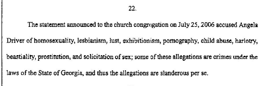 "[Driver's Attorney] said Angela Driver was accused in front of the congregation in effect of nine acts that ranged from bestiality to prostitution to child molestation because the pastor never named which one she actually was accused of doing."