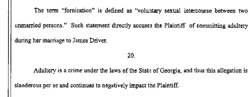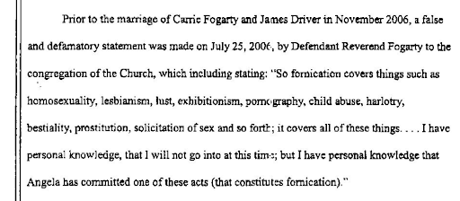 Angela's complaint, which was heard by a jury of her and Mark Fogarty's peers, states that this was more than just slander of reputation ... it goes against the state's definition of fornication and accuses her of committing a state crime(s) ... Adultery, child molestation and bestiality included: