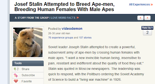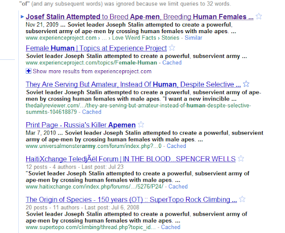 Soviet leader Joseph Stalin attempted to create a powerful, subservient army of ape-men by crossing human females with male apes. "I want a new invincible human being, insensitive to pain, resistant and indifferent about the quality of food they eat," Stalin was quoted in Moscow newspapers. The leadership was quick to respond, with the Politburo ordering the Soviet Academy of Science to build a "living war machine" in 1926.