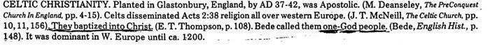 The English historian Margaret Deanesly (Arnold's "Deanseley" sic) never once makes any sort of a reference to anything resembly Acts 2:38 salvation being practiced in the Old Celtic Church. "pp. 4 -15" describe the ecclesastical seperation that the church enjoyed from Roman domination, but there is nothing there that even remotely describes anything resembling a UPC or OP style of worship or soteriology.